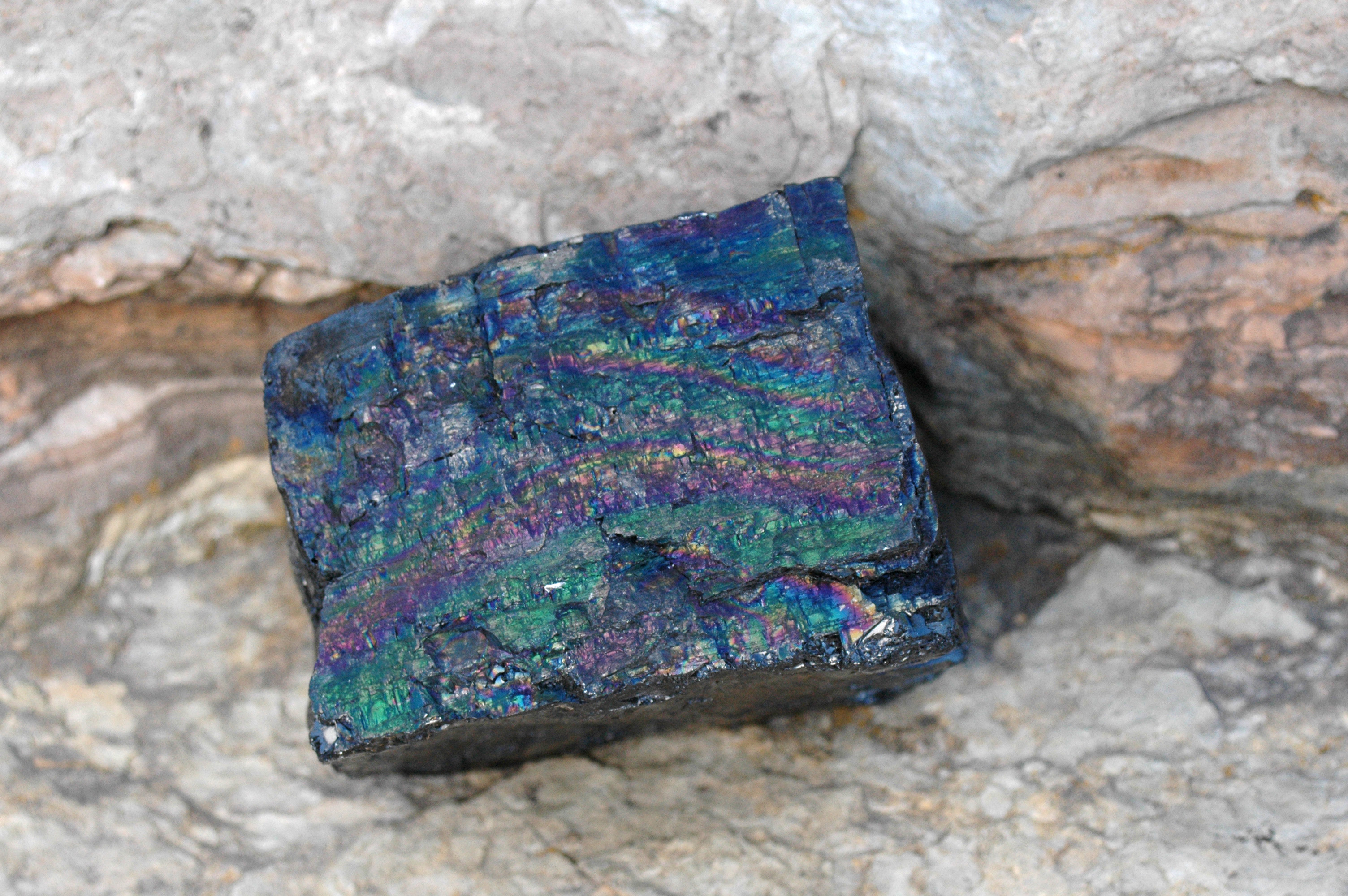 This sample is of peacock coal. Peacock coal is not a specific class of coal, but rather the name for an effect in which oxidizing materials in the coal create a dazzling array of colors on the surface of the coal. Usually it is short-lived, as the material fully oxidizes away shortly after exposed to air. Read more about our coal research here: https://www.usgs.gov/centers/cersc/science/us-coal-resources-and-reserves-assessment