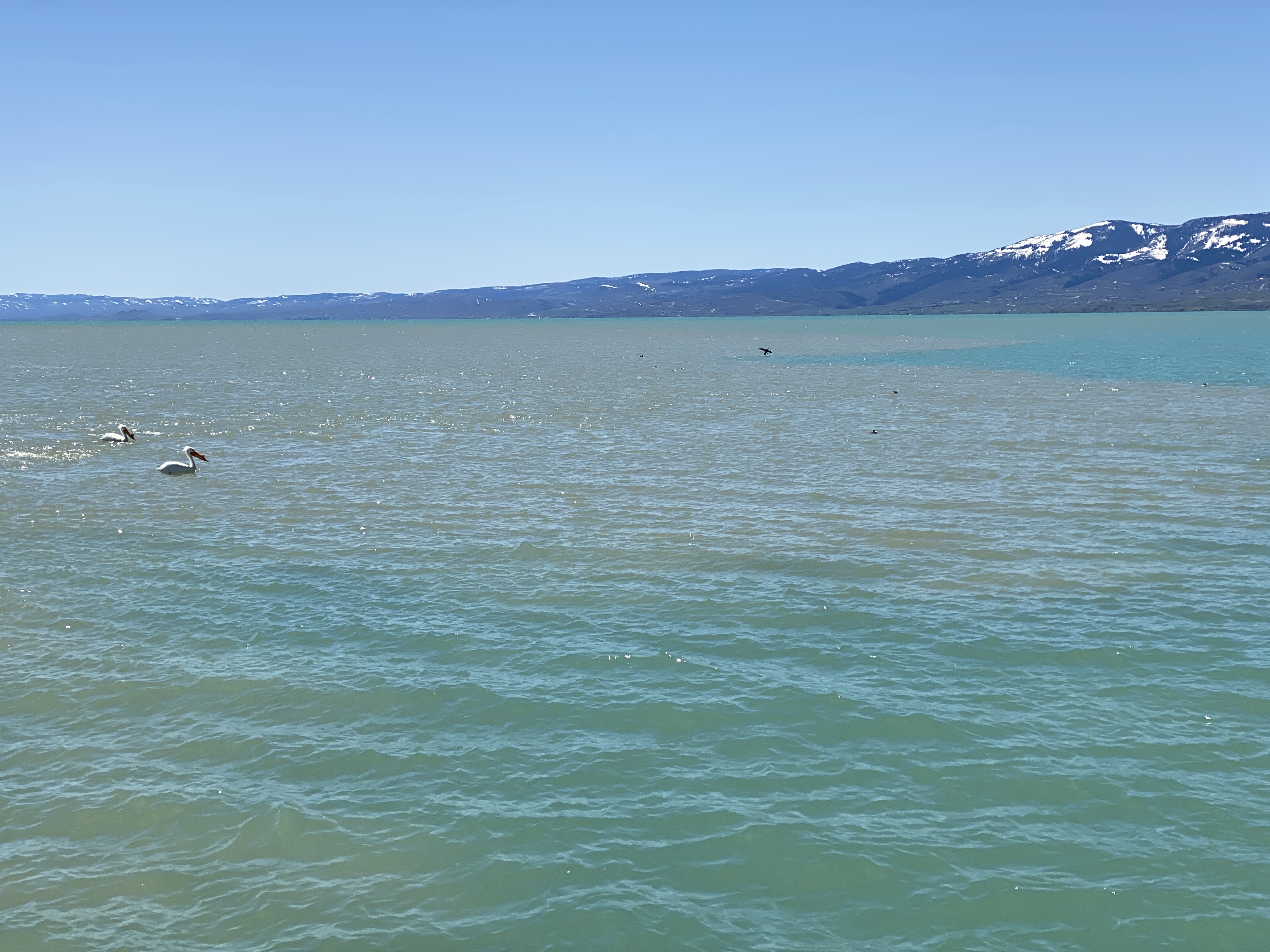 Pelicans and ducks enjoy that characteristic aquatic-blue Bear Lake in northern Utah-southern Idaho.