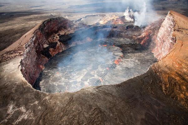 Aerial view of the perched lava lake in Pu‘u ‘Ō‘ō crater. Small fluctuations in the lava lake level lead to frequent overflows. These serve to build the levee around the lake even higher, amplifying the perched appearance.
