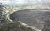 Person on east crater rim, with thinly crusted lava lake below. The crust has been freshly renewed after an episode of overturning. The wall is about 12 meters high.