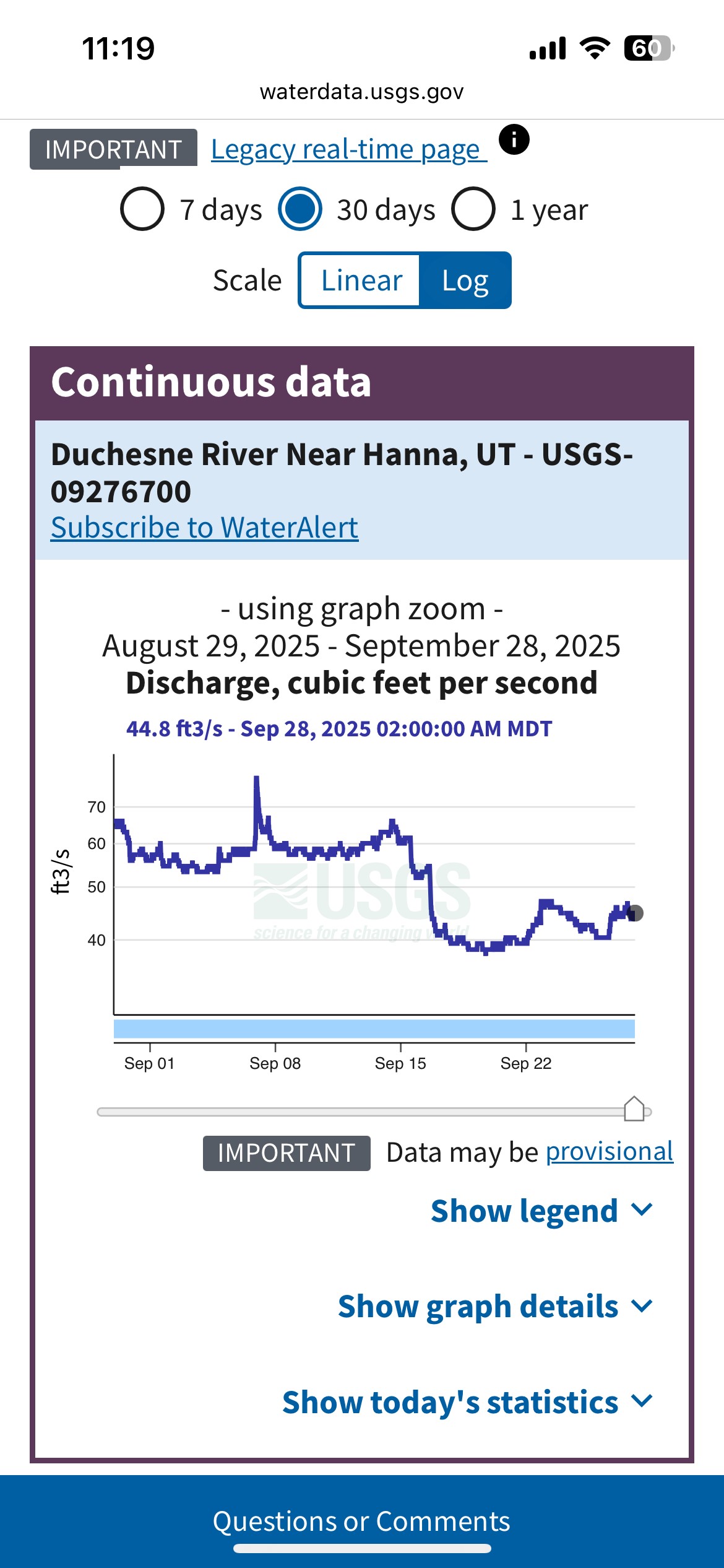This phone screenshot captured 30 days of discharge data, including field measurements, for the Duchesne River near Hanna, Utah.