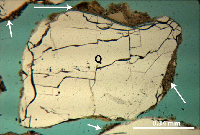 Photomicrograph of a polished thin section showing a cross-sectional view of a quartz sand grain (labeled Q) from a soil sample. The white arrows are pointing to fine grain coatings that can absorb and store nitrate. The thin section was made with blue-green epoxy, which can be seen in the pore spaces between grains.