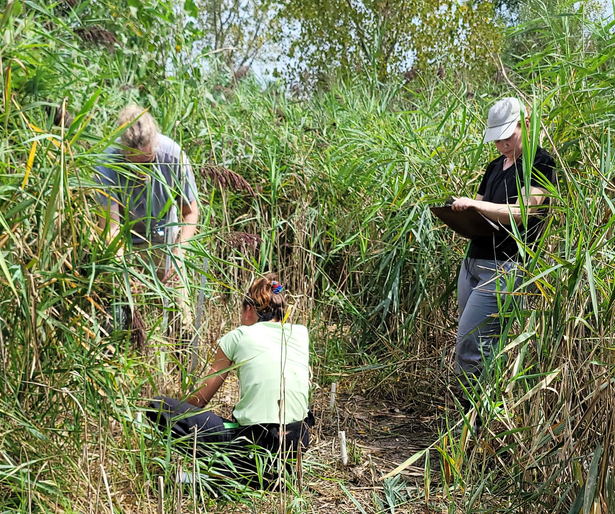 USGS scientists (GLSC; Ann Arbor, Michigan) assess the health of invasive Phragmites australis that was treated with a naturally derived herbicide. Photo Credit: Spenser Widin, USGS - GLSC.