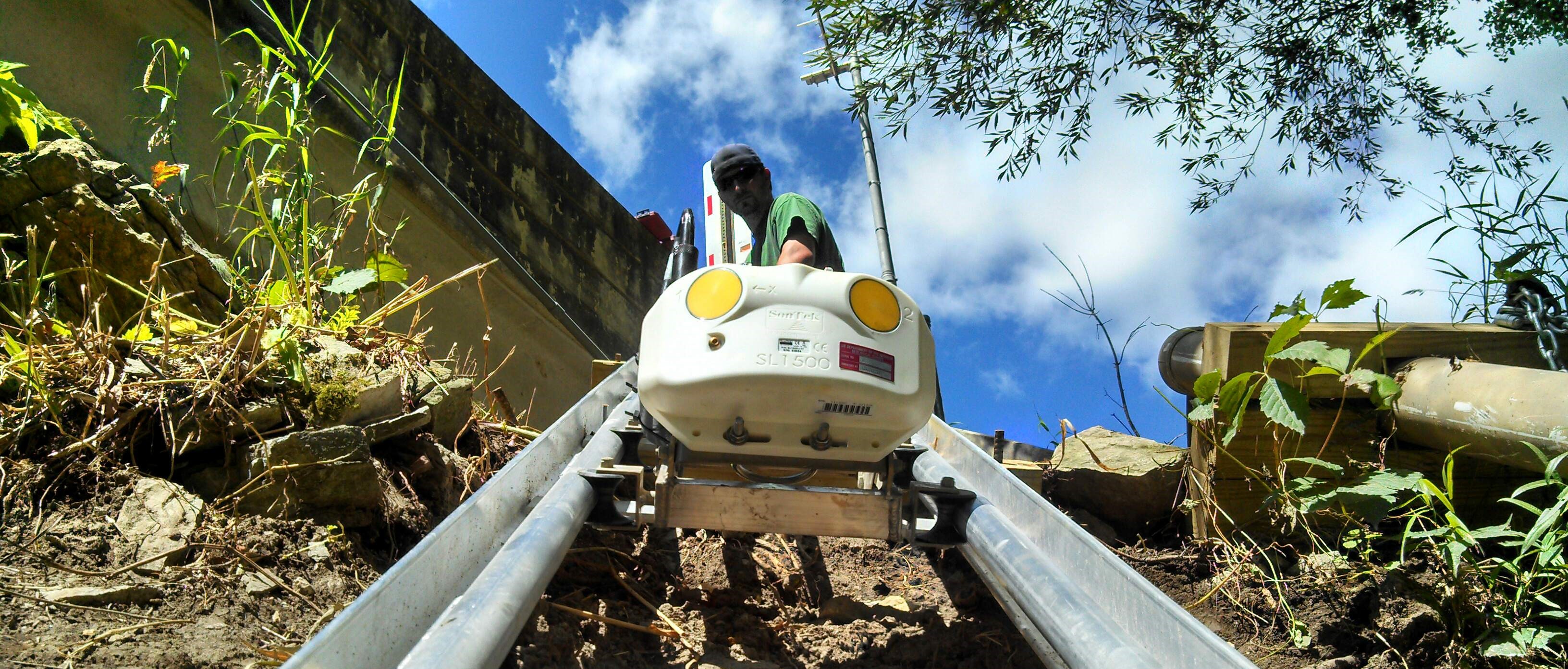 This picture shows a person on the bank of the river with a bridge behind the right side. The person is behind an acoustic Doppler velocity meter (ADVM). This ADVM is attached to a small trolley that has pucks that can move up and down an aluminum railway. The ADVM can be moved up and down this railway into the river and up to be serviced or cleaned out of the water.