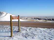 The Sharps Formation is youngest sedimentary rock formation of the White River Group. The Miocene sediments of the Sharps Formation crop out near the Pinnacles Overlook. This view is looking north toward the upland prairie near south end of the Wall Escarpment. The Wall Escarpment is a belt of White River Badlands that extends from the Pinnacles area northward toward the town of Wall, South Dakota. The Wall Escarpment represented a barrier to early travelers heading west toward the Black Hills and Wyoming Territory (The town of Wall, South Dakota developed at the north end of the Wall Escarpment). The trail up the small hill behind the Pinnacles Overlook sign leads to the top of a small knob of the Sharps Formation.