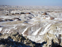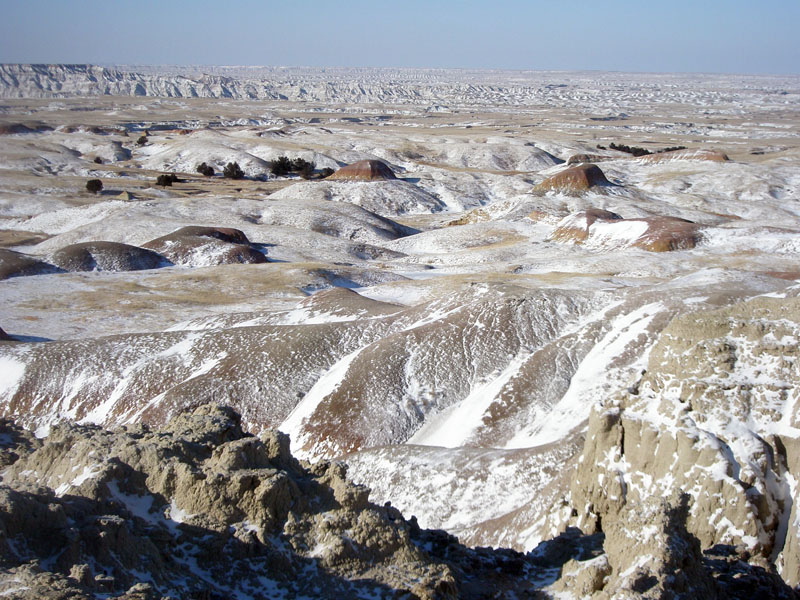 Small buttes of red and orange Fox Hill Formation cap the rolling landscape underlain by Cretaceous-age marine sedimentary rocks of the Pierre Shale and Fox Hills Formation. The Cretaceous sedimentary beds tend to be covered with thick grasses and shrub forest along ravines. The soil formed from the shaley, marine sediments contain more essential mineral nutrients for plants and hold more soil moisture than the overlying continental sediments of the White River Group exposed in the badlands.DIGITAL CAMERA