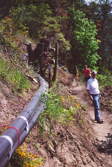 Water and sewer line, temporarily relocated on top of landslide material after the Salmon Beach landslide triggered by the Nisqually, Washington earthquake. Original sewer and water lines were damaged by the slide.