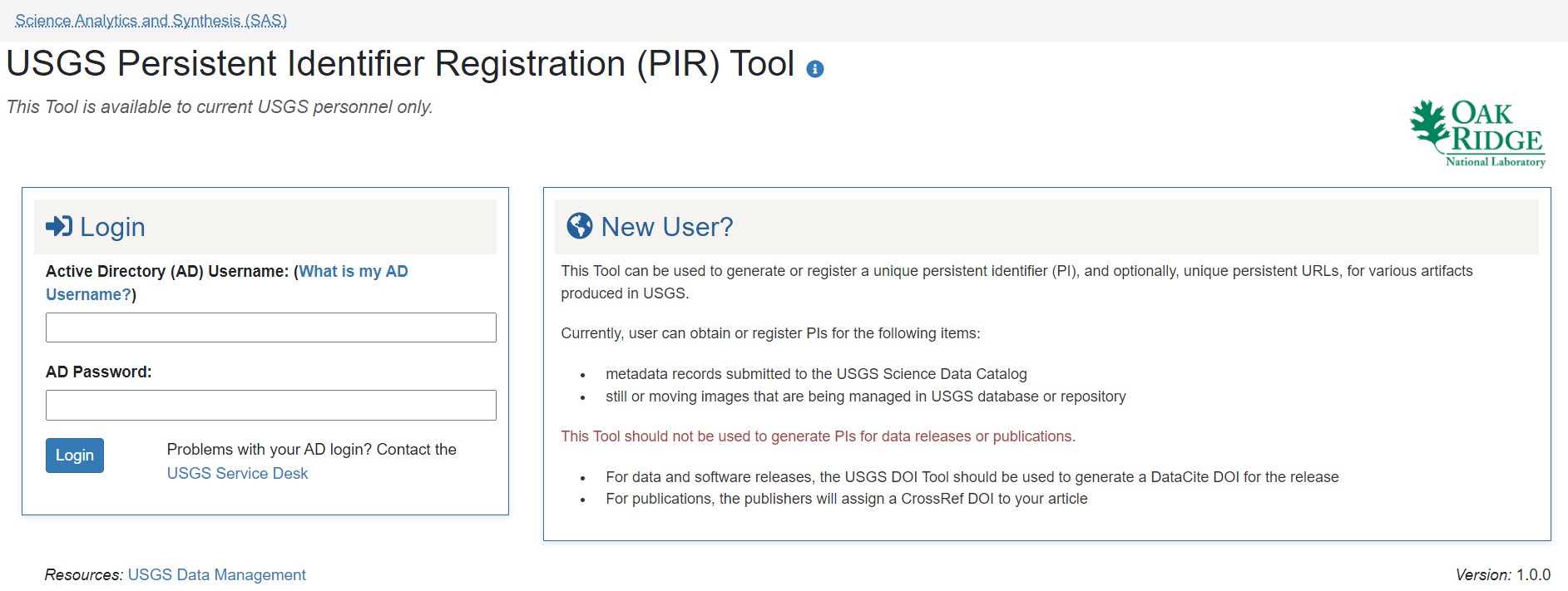 Screenshot of the Persistent Identifier Registration (PIR) Tool