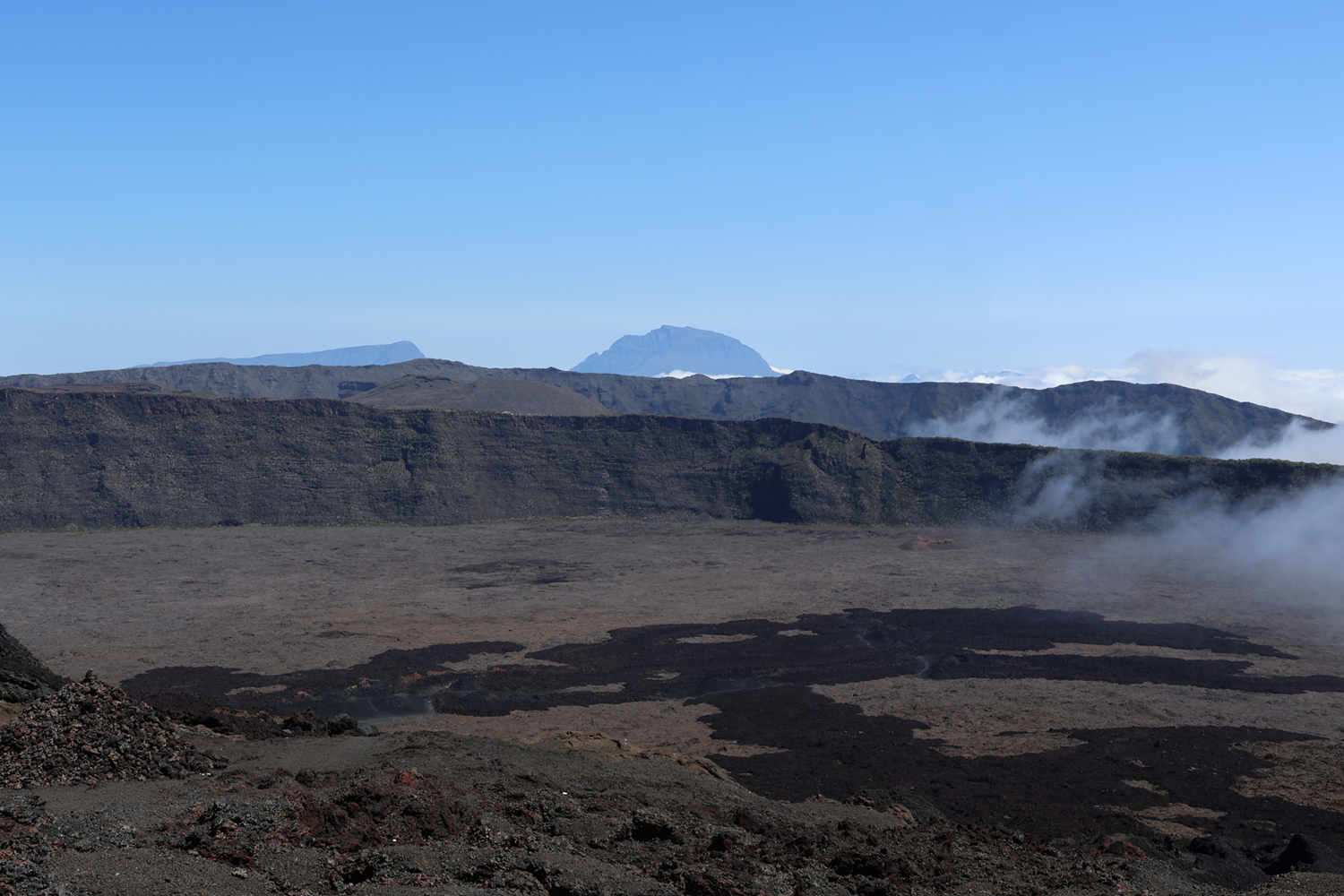 Photograph taken from the western flank of the Piton de la Fournaise (Reunion Island, Indian Ocean) looking westward to Piton des Neiges. Cliffs in image are scarps associated with previous edifice collapses.