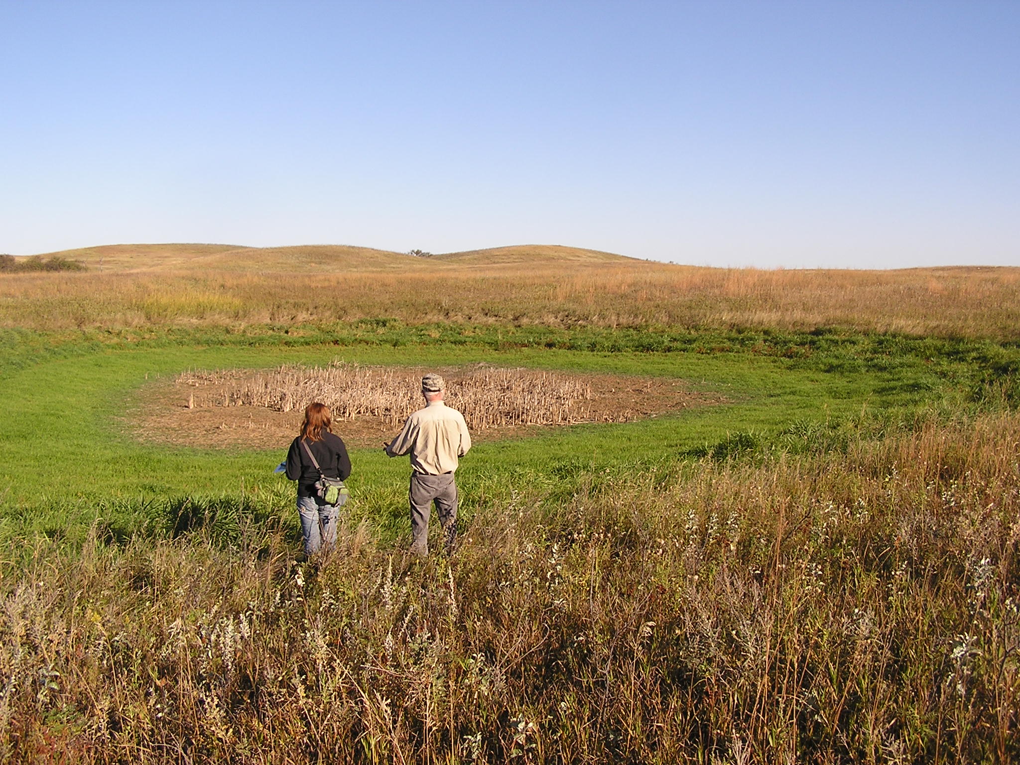 Ryann Cressey and Harold Kantrud examine plant community zones in a temporary wetland at Mt. Moriah study area, Stutsman County, North Dakota.
