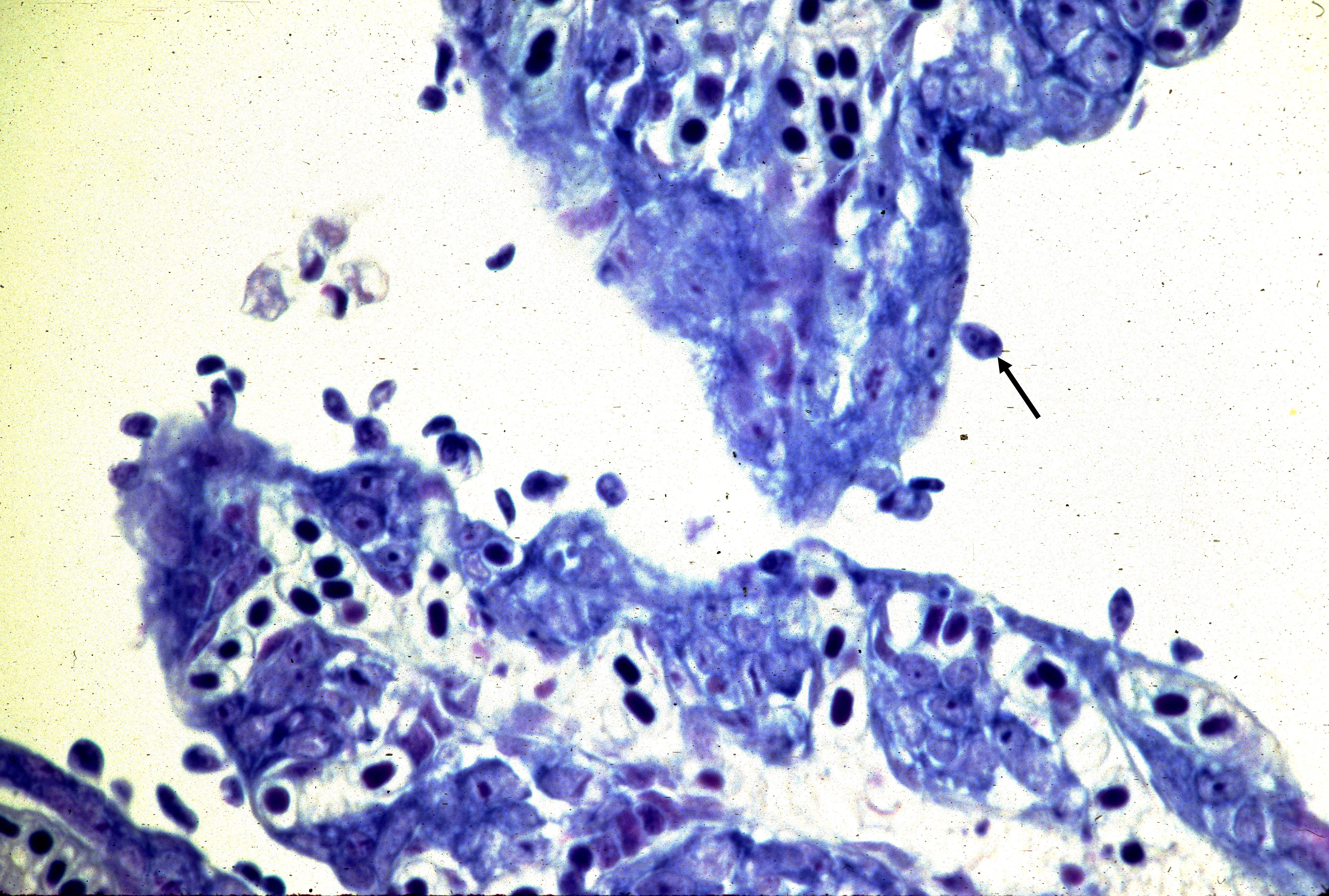Ichthyobodo necator (Costia) are attached to the gill surface (arrow) of a yearling sockeye salmon, Oncorhynchus nerka. Note hypertrophy and hyperplasia of the lamellae epithelium. May-Grünwald Giemsa (M-G G) stain. X800. Image size: 5240w x 3535h (72 dpi); 72.778 in. x 49.097 in.
