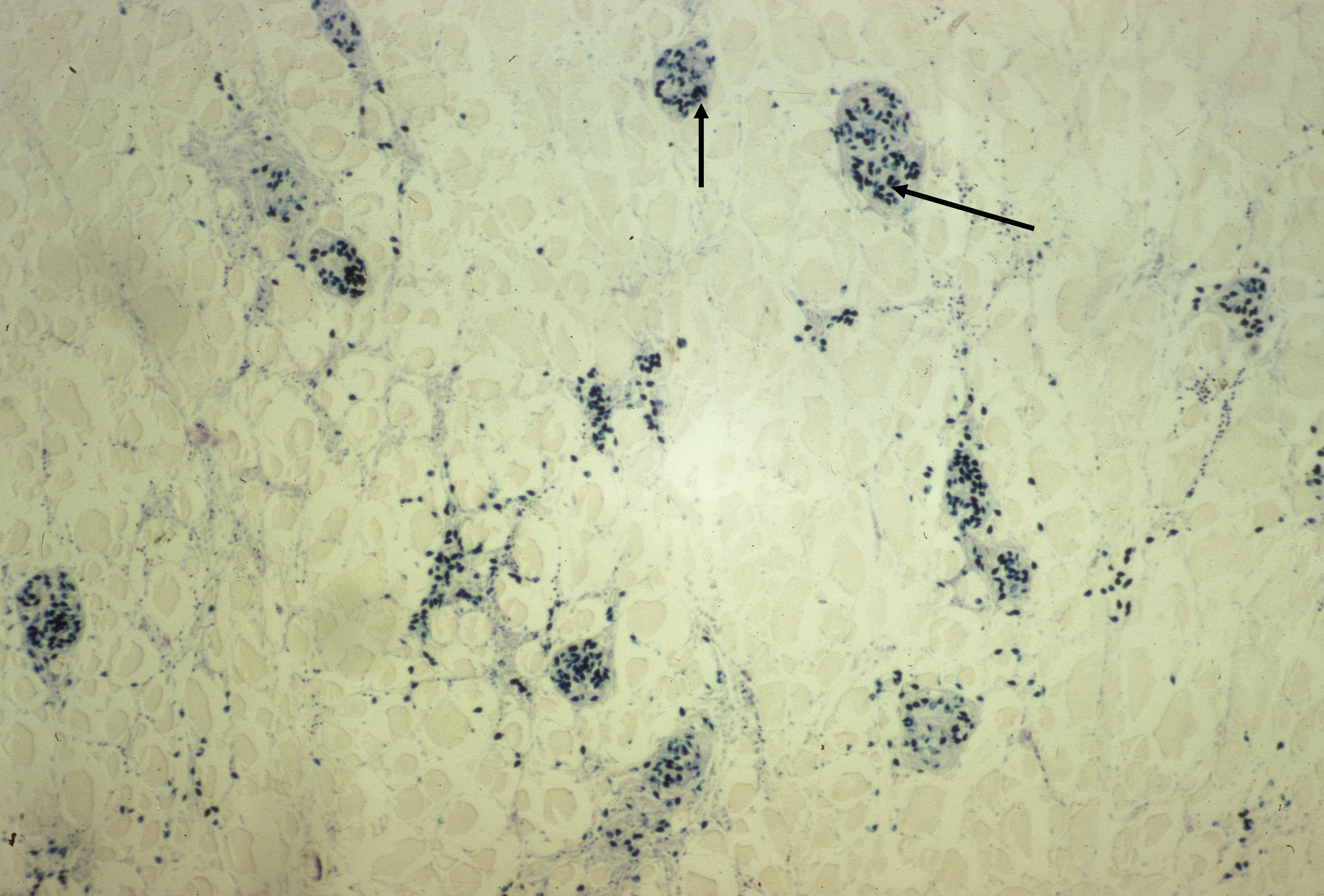 Plate 11, Figure 32: Myxobolus sp. spores (arrows) in the dorsal striated muscle of a yearling coho salmon. M-G G stain. X140. 5177w x 3504h (72 dpi). 71.903 in. x 48.667 in.