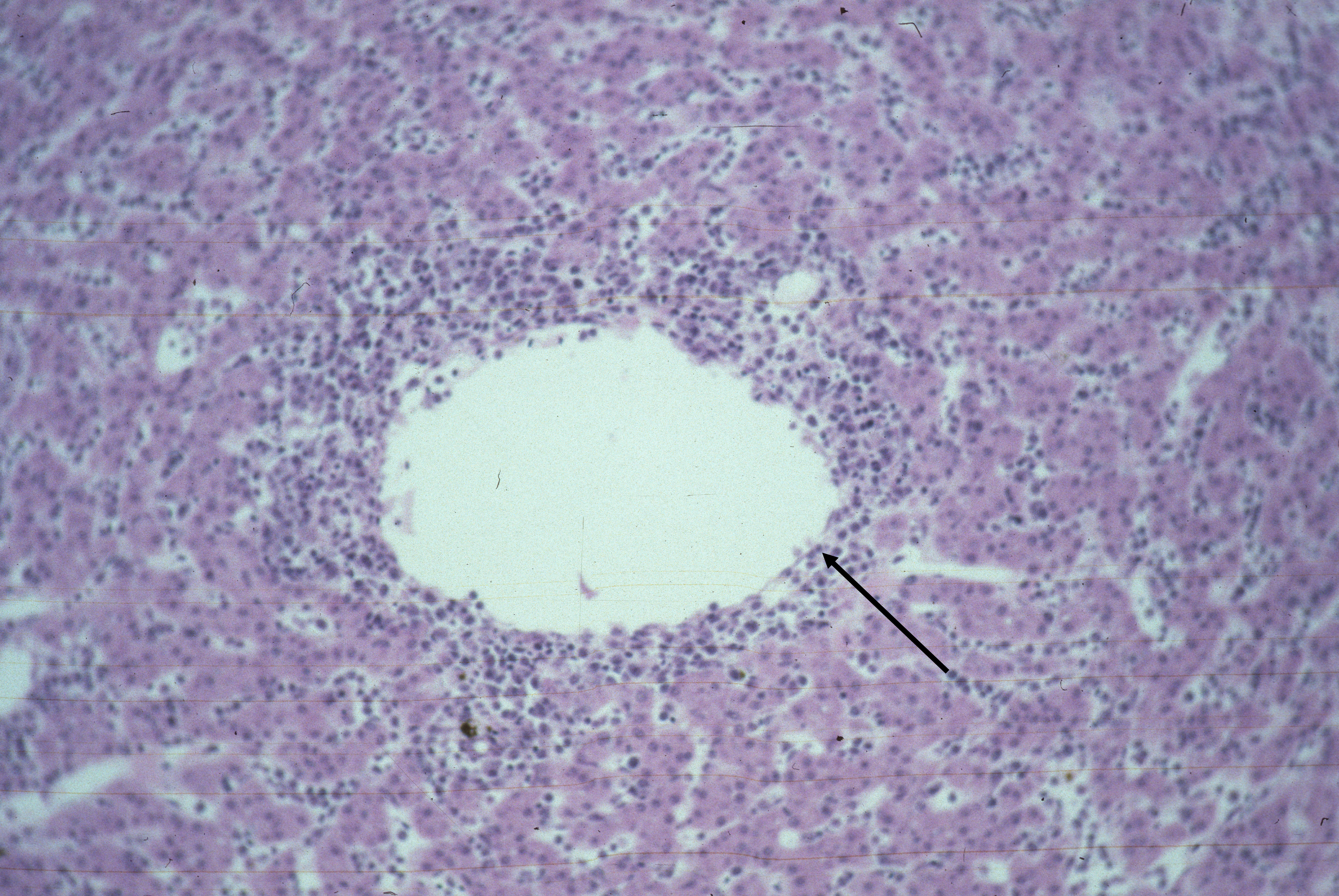 Plate 20, Figure 60: N. salmonis infected fingerling steelhead with perivascular cuffing of affected hepatic cells (arrow). H&E stain. X160. (Courtesy of B. MacConnell). 5187w x 3472h (72 dpi). 72.042 in. x 48.222 in.