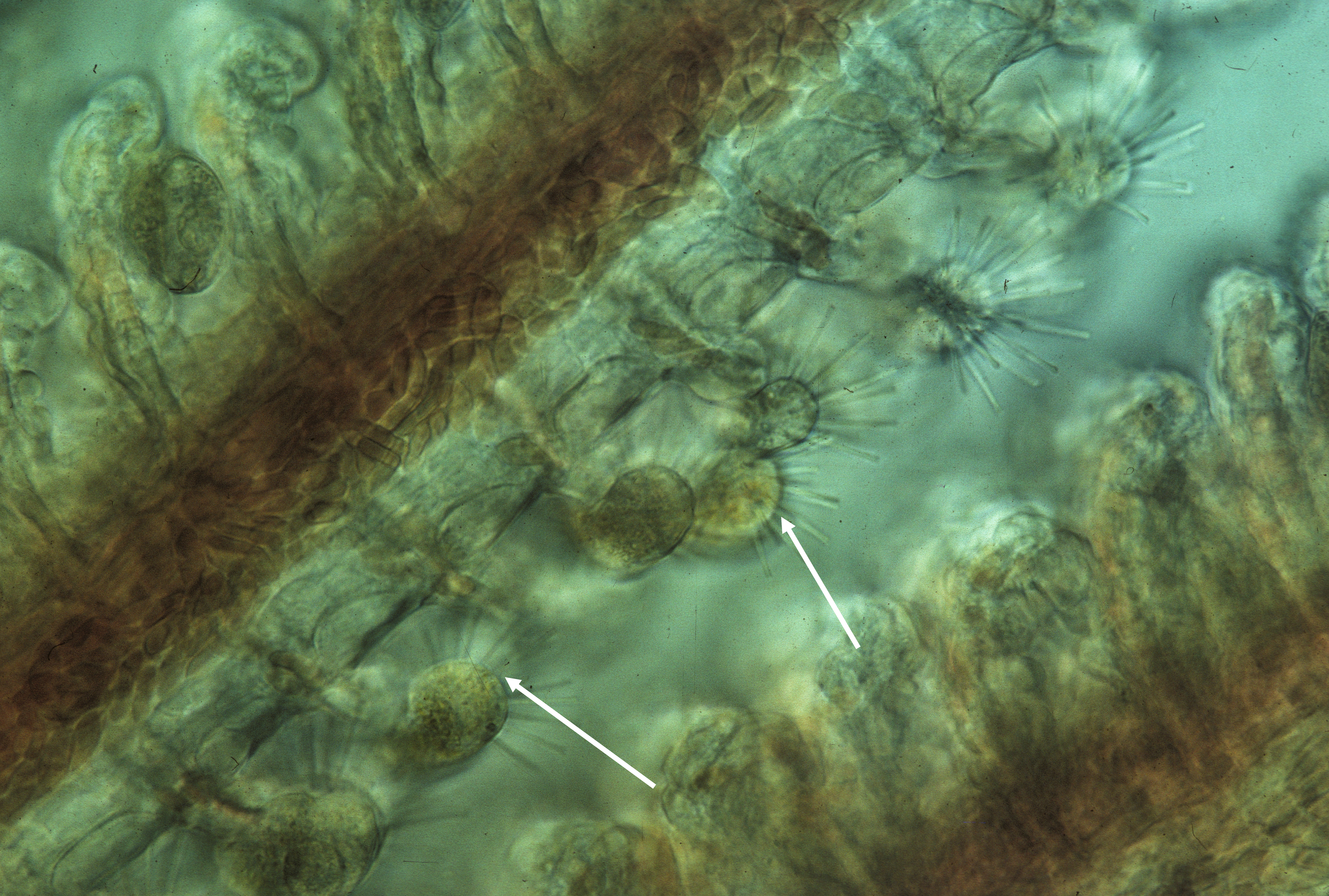 Plate 4, Figure 11: Trichophrya sp., a suctoran ciliate. Note numerous rod-like tentacles (arrows) on the gill lamellae of sockeye salmon. Phase contrast. X500. 5166w x 3483h (72 dpi). 71.75 in. x 48.375 in.