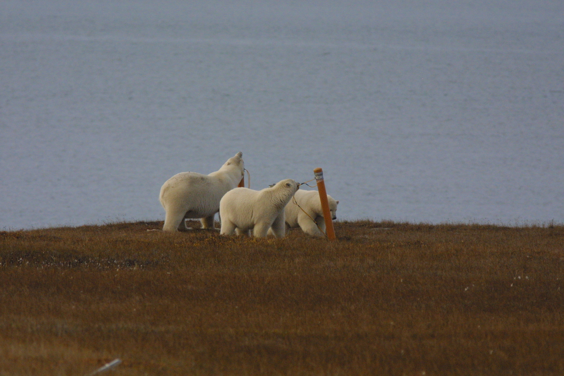 The bollards and rope used to cordon-off survey equipment prove too tempting to curious polar bears on Barter Island, on the North Slope of Alaska.