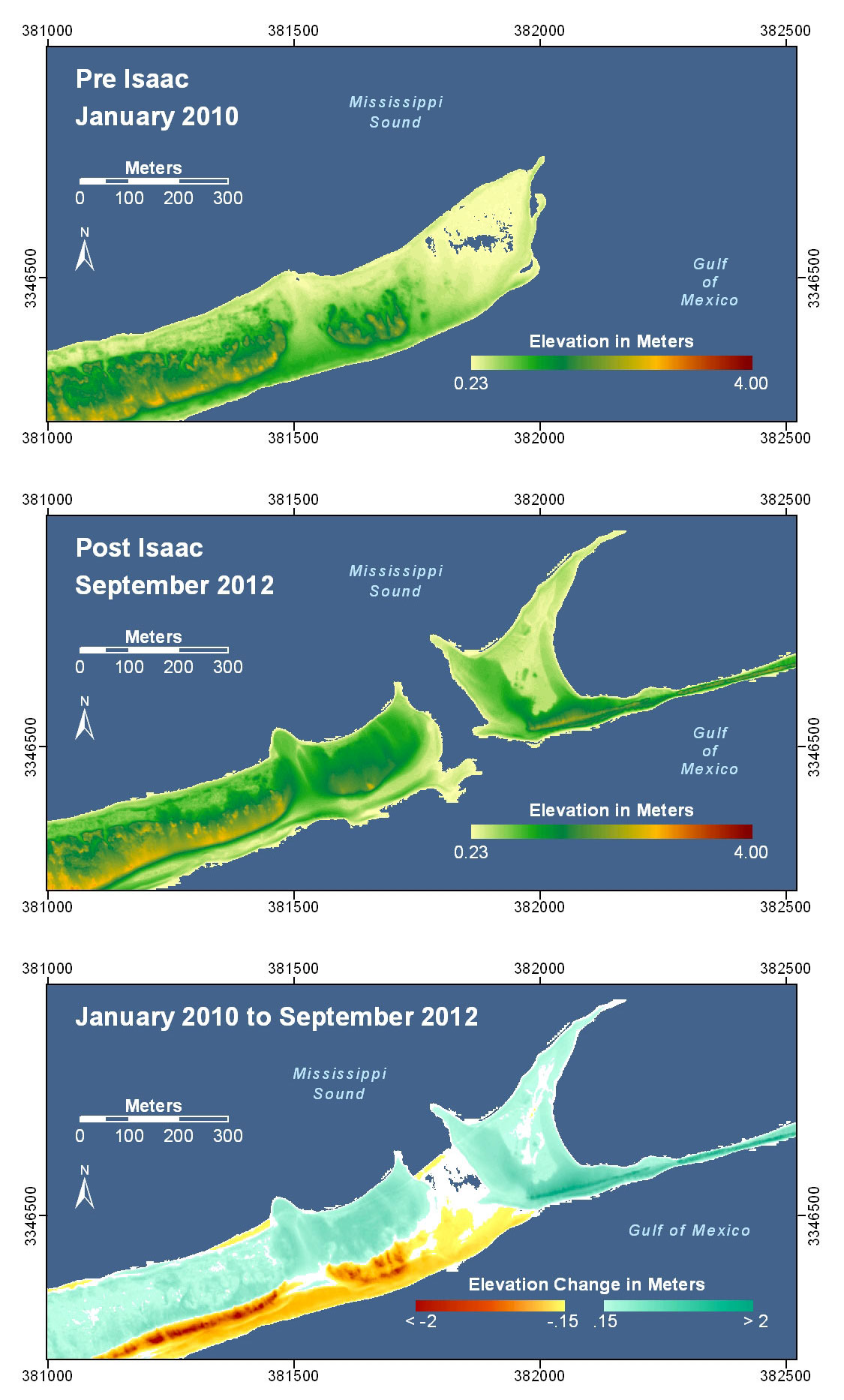 West of Katrina Cut, Dauphin Island, Alabama. The inlet that formed during Hurricane Katrina was closed with a rock structure (see photo pair locations 2 and 3) after collection of the pre-storm lidar and prior to Isaac's landfall and appears as a depositional feature. During Isaac, the island to the west end of the cut was breached and experienced shoreline erosion and overwash. The spit feature behind the rock structure formed prior to landfall.