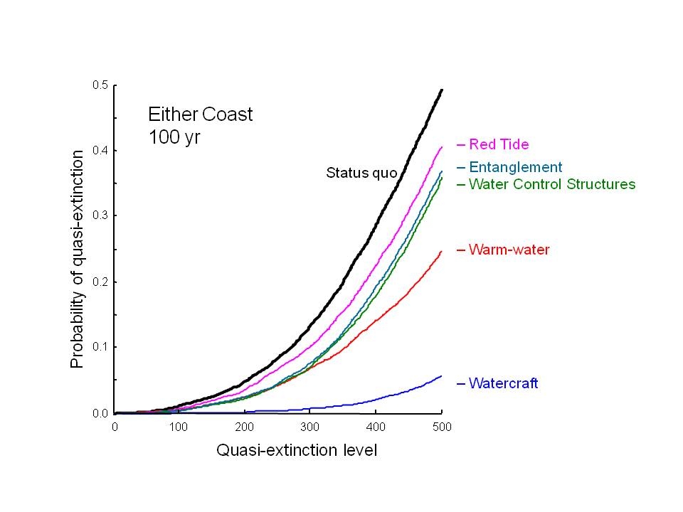 Probability of quasi-extinction for manatees over 100 yr, under a variety of scenarios that would address individual threats.
