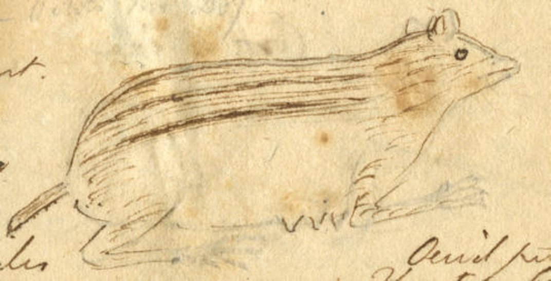 The “white-striped lemming”, Lemmus albovittatus Rafinesque (1818), based on a fraudulent account by John James Audubon. See Woodman (2016): “Pranked by Audubon.” (pen-over-pencil sketches from Rafinesque’s field notebook 17: image SIA2012-6095 courtesy of the Smithsonian Institution Archives, Washington, DC.).