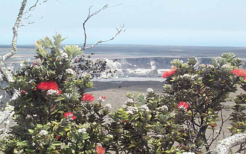 Halema‘uma‘u Crater, (3646 feet elevation) also known as the fire pit, located within the larger Kīlauea Crater gives the impression that it is being adorned with a ready-made haku lei. The ‘ōhi‘a tree is in the foreground overlooking Halema‘uma‘u Crater creating this impression. Halema‘uma‘u literally means fern house or "the house of the ‘ama‘u‘ama‘u fern".