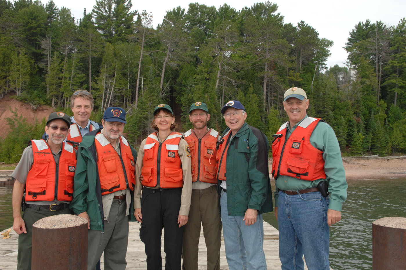 Secretary Salazar meets Michigan Island volunteer lighthouse keepers Pat Fahrenkrug and Mike Anderson. Left to right are Apostle Islands National Lakeshore Superintendent Bob Krumenaker, Assistant Secretary for Fish Wildlife and Parks Tom Strickland, Congressman David Obey, Volunteers Pat Fahrenkrug and Mike Anderson, Secretary Salazar and Acting Director of the National Park Service Dan Wenk.