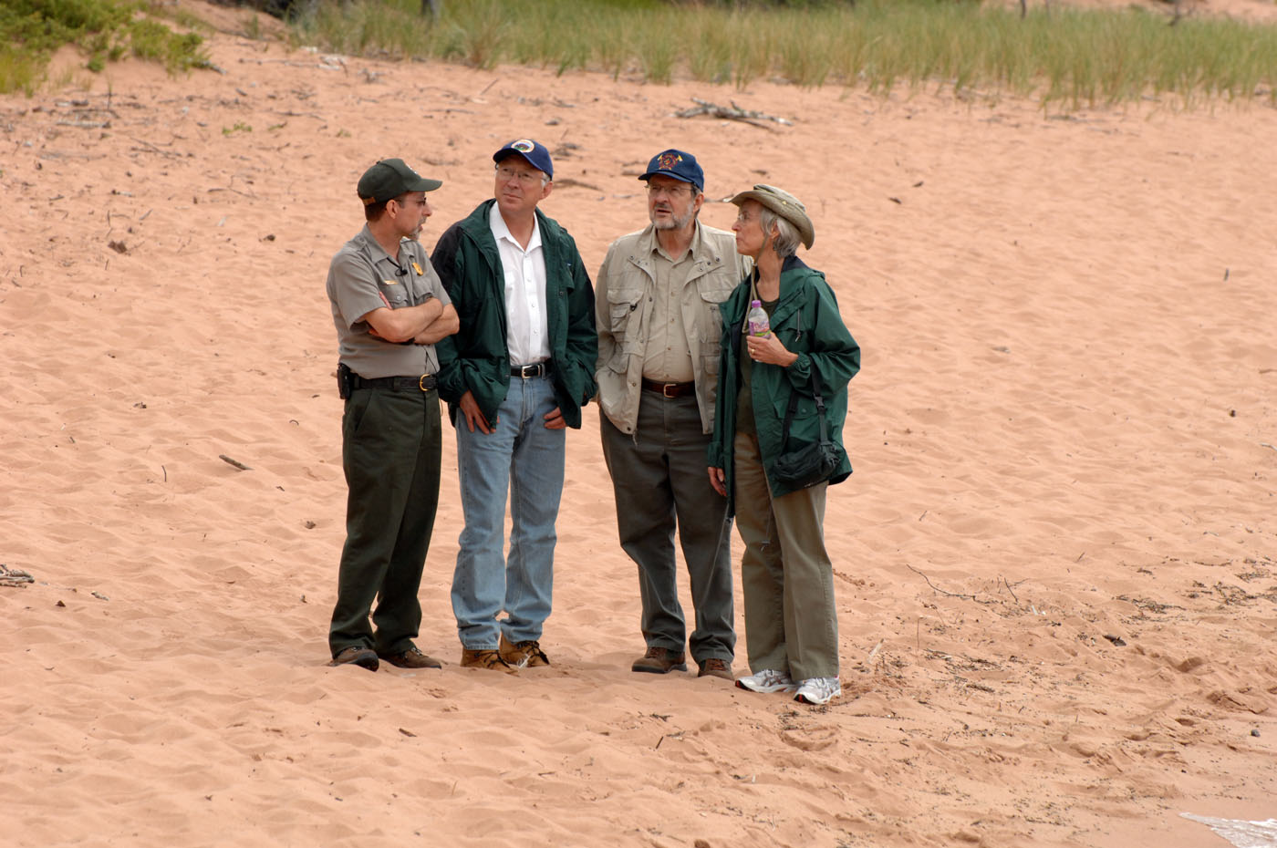 Superintendent Bob Krumenaker, Secretary Salazar, Congressman David Obey and his wife Joan Obey stand on the beach at Julian Bay on Stockton Island. It is the largest of the Apostle Islands and has one of the greatest concentrations of black bears in North America