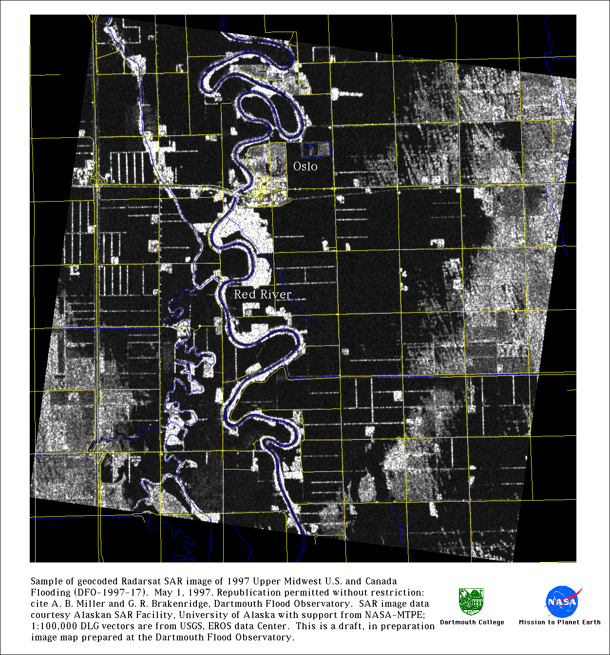 Sample of geocoded Radarsat SAR image of 1997 Upper Midwest U.S. and Canada Flooding. May 1, 1997. Republication permitted without restirction: cite A. B. Miller and G. R. Brakenridge, Dartmouth Flood Observatory. SAR image data courtesy Alaskan SAR Facility, University of Alaska with support from NASA-MTPE; 1:100,000 DLG vectors are from USGS, EROS Data Center. This is a draft, in preparation image map prepared at the Dartmouth Flood Observatory.