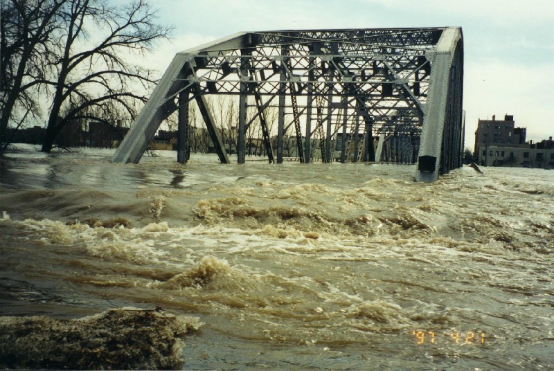 The Sorlie Bridge between Grand Forks, North Dakota, and East Grand Forks, Minnesota, during the 1997 Red River of the North flood.