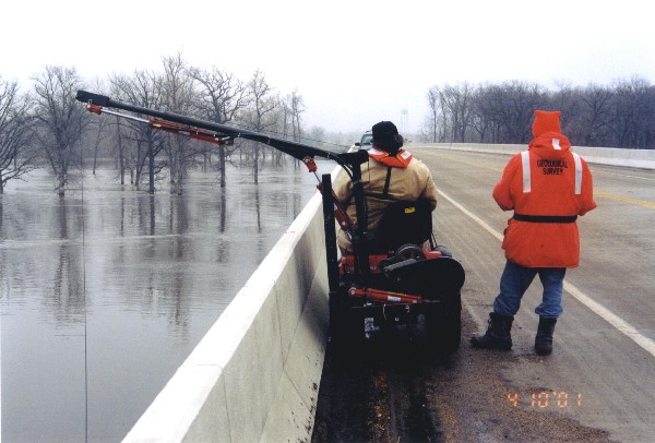 USGS personnel making streamflow measurements off a bridge April 10, 2001