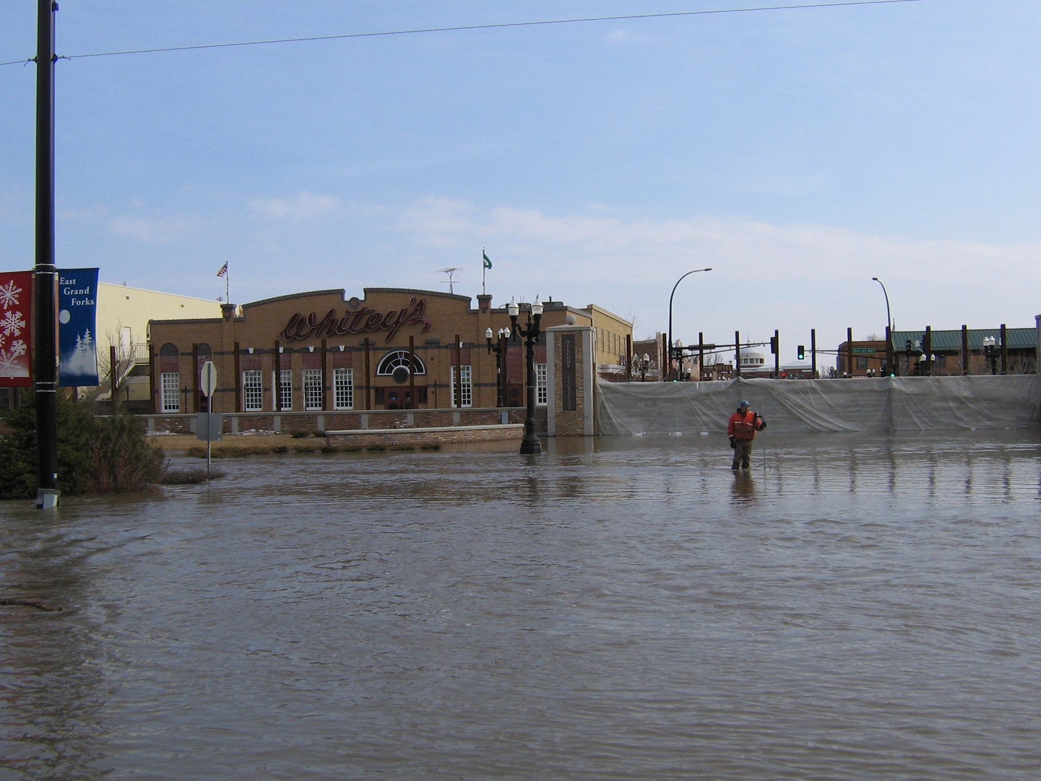 USGS personnel measuring flood overflow near Whiteys Restaurant in East Grand Forks, ND.