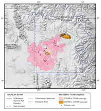 Digital elevation model of Yellowstone Caldera and the surrounding region, showing the distribution of rhyolite eruptions that occurred following the most-recent caldera forming eruption at 631,000 years ago.