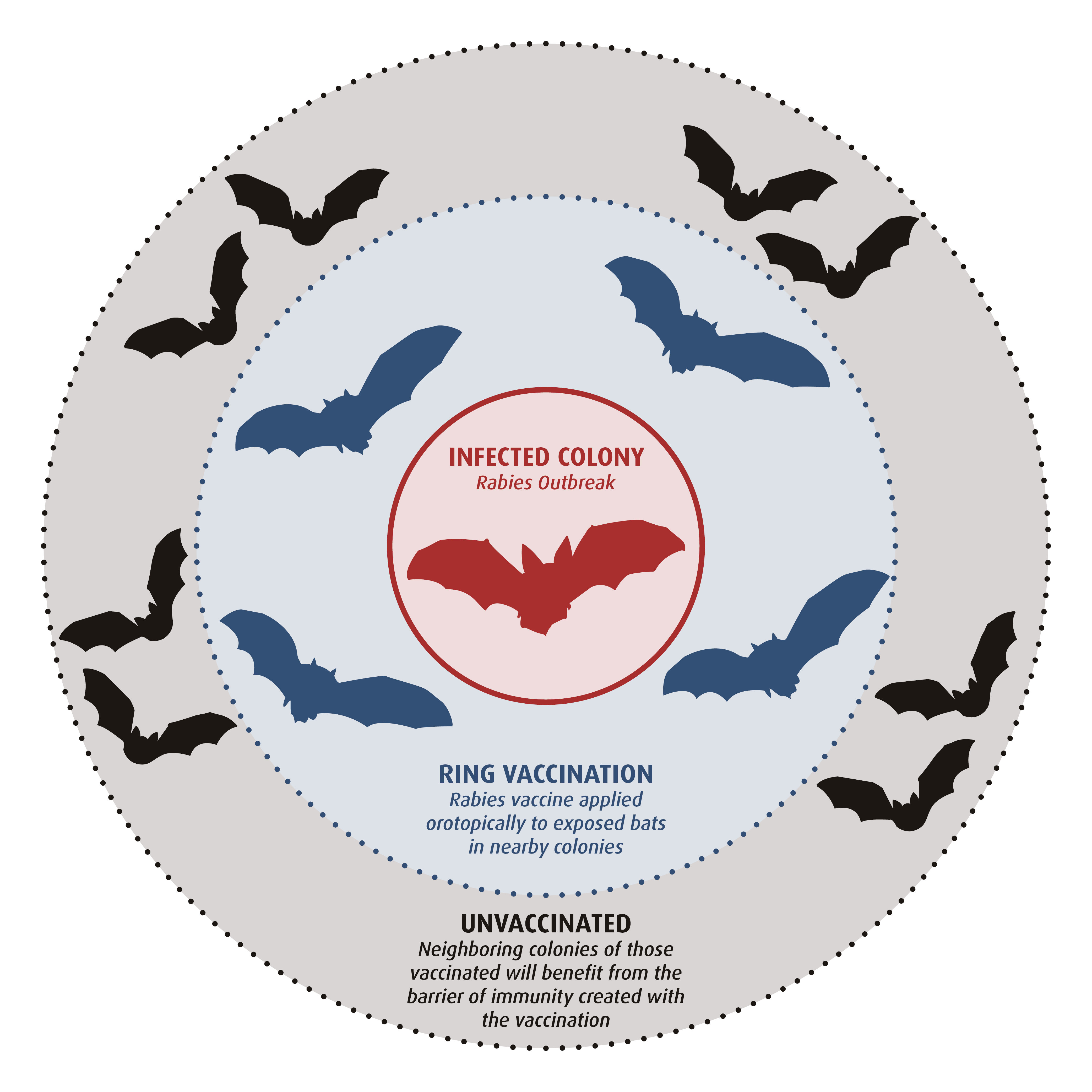 When rabies is detected in a vampire bat (Desmodus rotundus) colony (small pink circle), ring vaccination can be used to create a barrier of immunity to stop rabies spread beyond that area. The orotopical rabies vaccine would be applied to vampire bats in nearby colonies (blue circle). This helps create a barrier of immunity to help protect other nearby bat colonies.