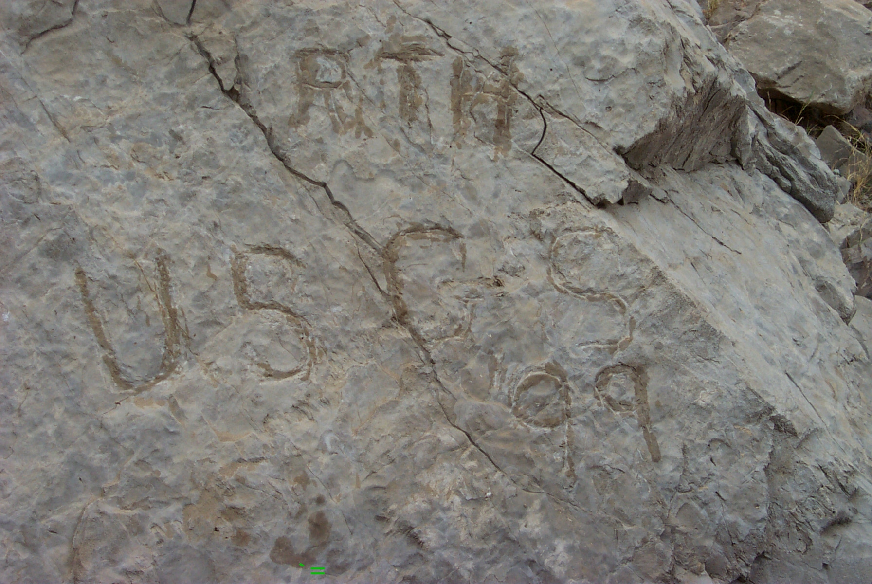 Robert Hill, Father of Texas Geology, carved initials from his 1899 Rio Grande field survey. Photo was taken during 2002 USGS Rio Grande field trip.