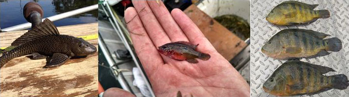 From left to right: sailfin catifsh (Pterygoplichthys spp.), African jewelfish (Hemichromis letourneuxi), Mayan cichlid (Cichlasoma urophthalmus)