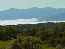 This zoomed-in view is looking west from just outside the Pinnacles' West Side park boundary toward the fog-filled Salinas Valley and the high peaks of the Ventana Wilderness in the Lucia Range. Junipero Serra Peak (middle) is 1787 meters (5,862 feet).