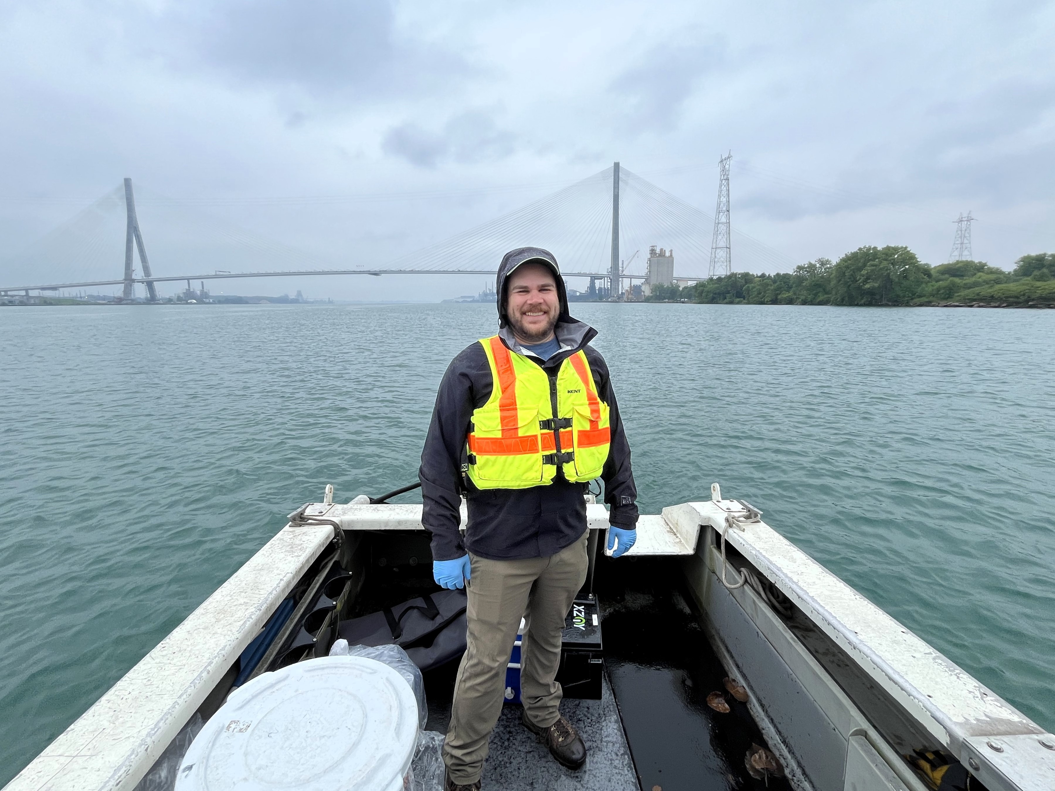 Physical scientist Brent Heerspink conducts sampling on the Detroit River with the Gordie Howe International Bridge in the background.