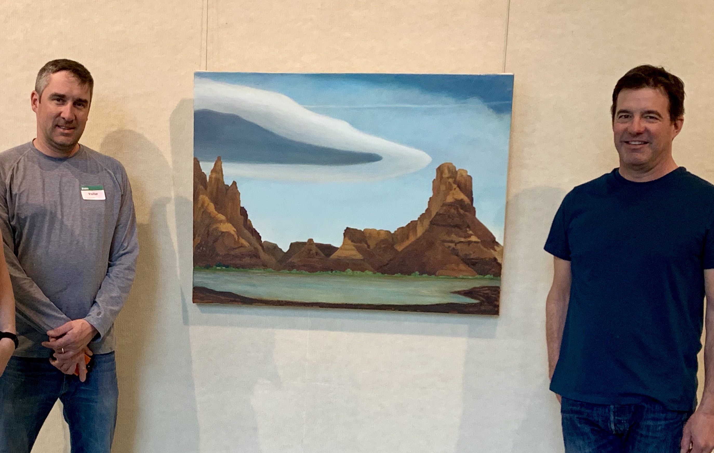 David Jones and Patrick Kikut stand on either side of an oil painting by Kikut, showing red rocks and blue sky along a river. This painting is part of the exhibition "Artwork of the Sesquicentennial Colorado River Exploring Expedition (SCREE)" on display during the month of March at USGS Headquarters in Reston, Virginia.