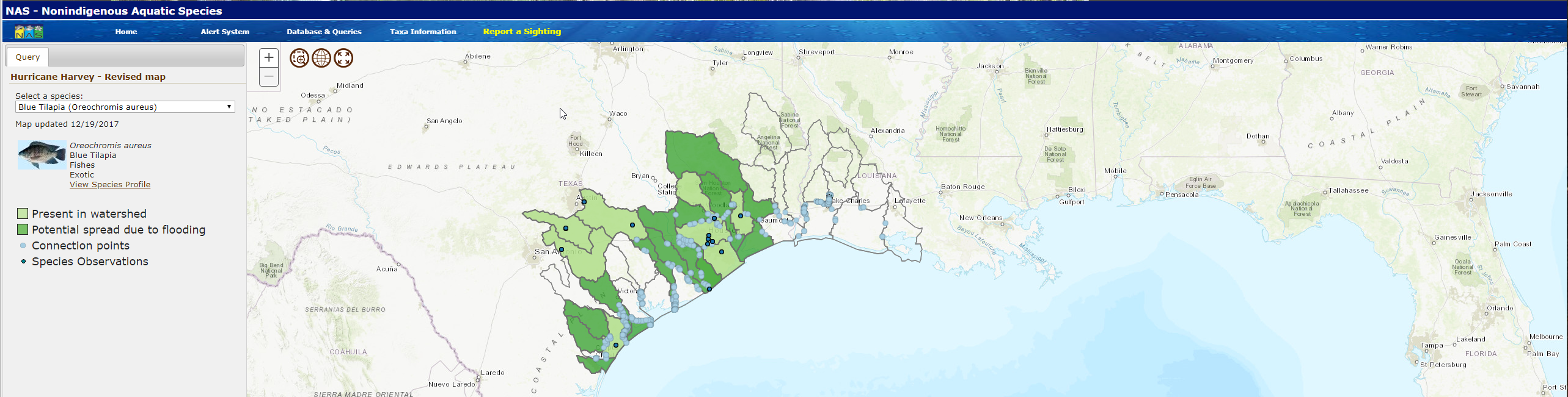 Screen shot of the Nonindigenous Aquatic Species Database flood map from Hurricane Harvey.