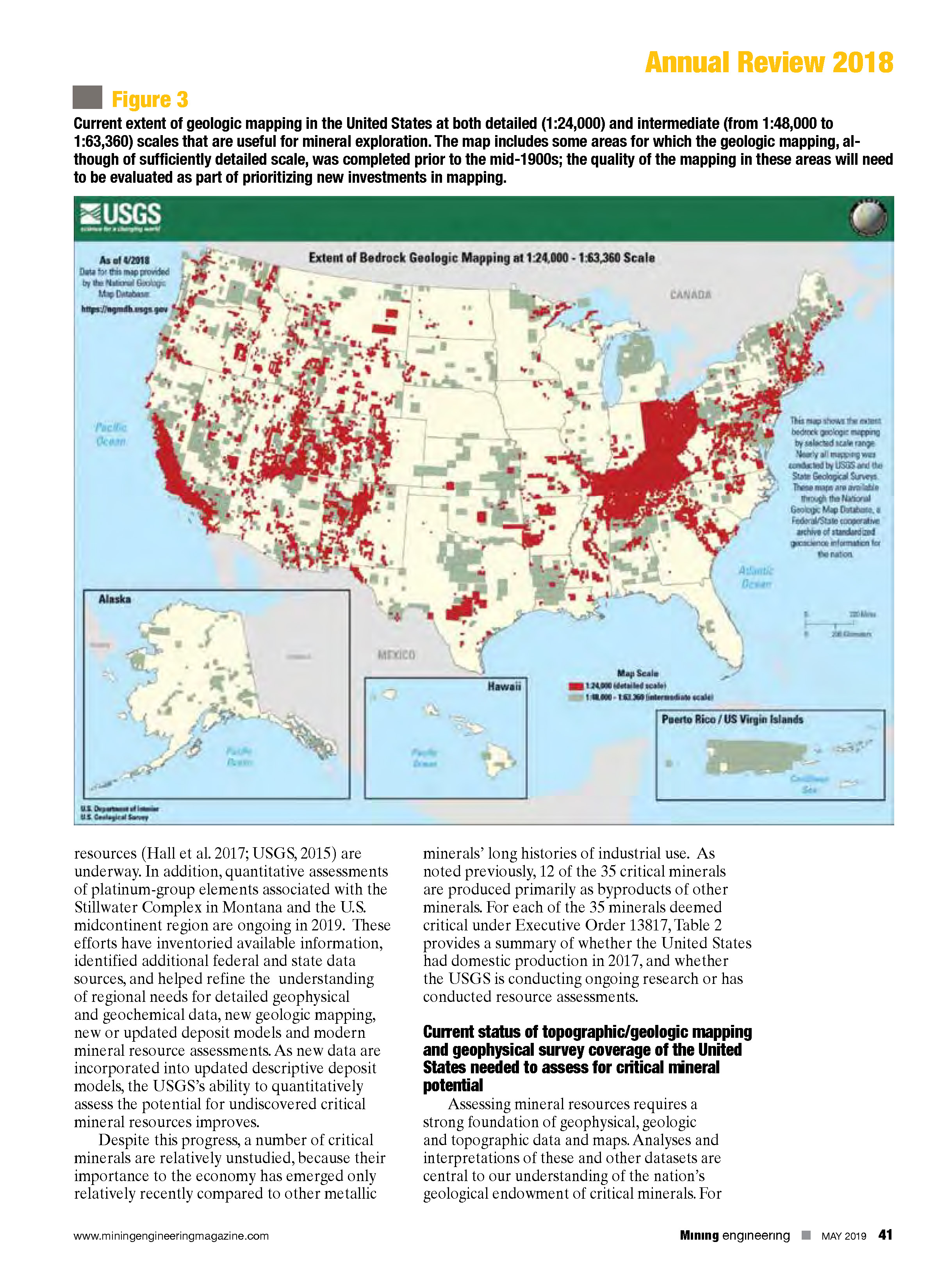 Image found in review paper for publication in Mining Engineering, the monthly publication of the Society for Mining, Metallurgy, and Exploration. The paper reviews the work of the U.S. Geological Survey on the topic of critical minerals. Mineral Resources Program core competencies in critical mineral information, modelling, and evaluation, critical mineral resource assessments, topographic and geological mapping, and geophysical surveys, and critical minerals research are reviewed, covering published work from the past 2-3 years.