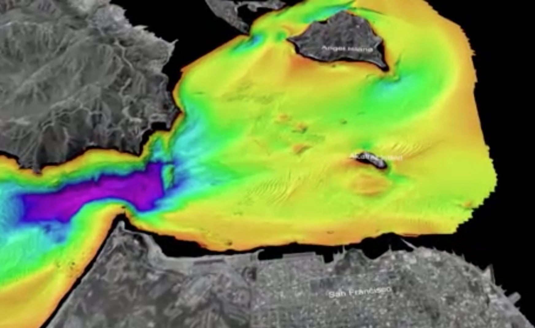 Screenshot of a computer simulation that shows the seafloor under and near the Golden Gate Bridge in San Francisco, California.