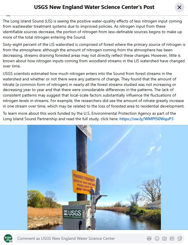 A Facebook screenshot about a USGS study where scientists estimated how much nitrogen enters into Long Island Sound from forest streams in the watershed.