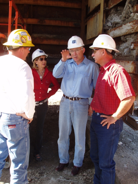 During his visit to Port Fourchon this morning, Secretary of the Interior Ken Salazar is briefed by Ron Ferguson, BP's Gulf of Mexico Shore Base coordinator, on the 40-foot metal containment structure that is being transported to the site of the leak and deployed to the seabed during the next 48 hours to cover the largest leak at the end of the broken riser pipe. The oil will be captured and conveyed via riser pipe from the containment dome to the surface, where the BP vessel Deepwater Enterprise will collect, separate and store the oil for transport to shore facilities. If no major problems are encountered, the system could be operational by Sunday.