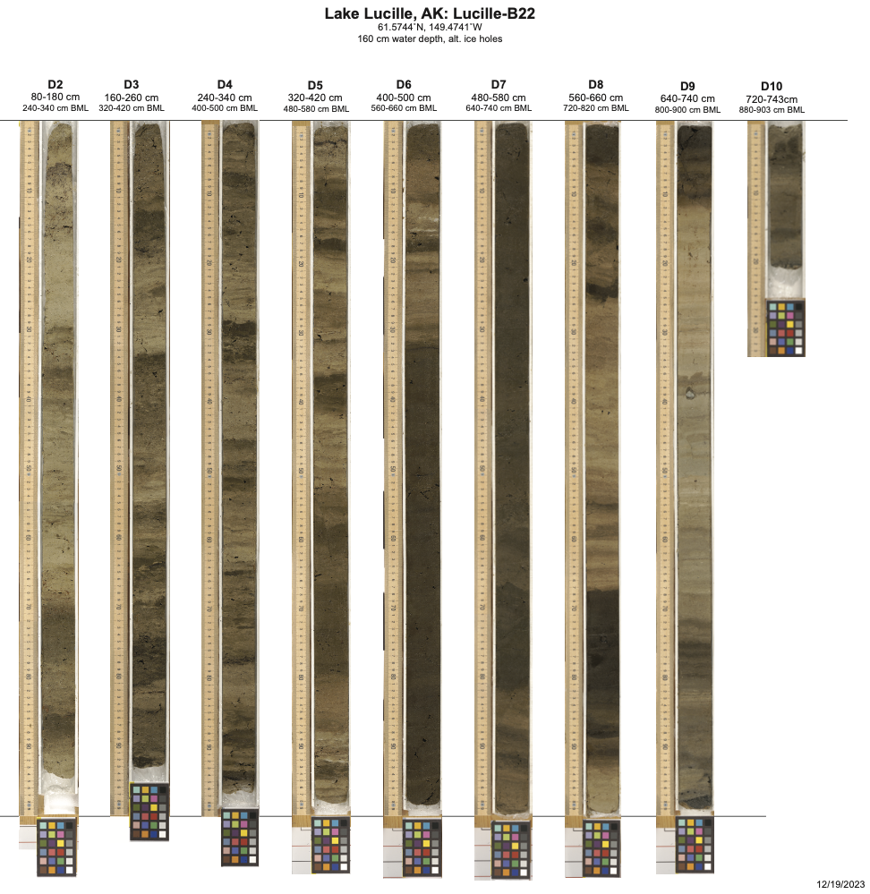 Photography of split sediment cores is calibrated for color/light. This example is from Lake Lucille, Alaska.