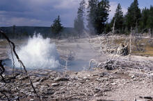 Seismic Geyser on the east bank of the Firehole River in the Upper Geyser Basin. Detailed observations by Don White and George Marler showed that within several days after the 1959 magnitude 7.2 Hebgen Lake earthquake, two new fractures with steam discharge (fumaroles) were formed. In less than a year, the lodgepole pines over an area of at least 500 feet (about 150 meters) were either dead or dying. In the winter of 1962-1963, explosive activity had begun, and a new crater formed. Around the crater, numerous blocks of sinter up to 3 feet (about 1 meter) in diameter were spread randomly. By 1963 the fumarole had evolved into a small geyser. Photo by George Marler, 1965, National Park Service.