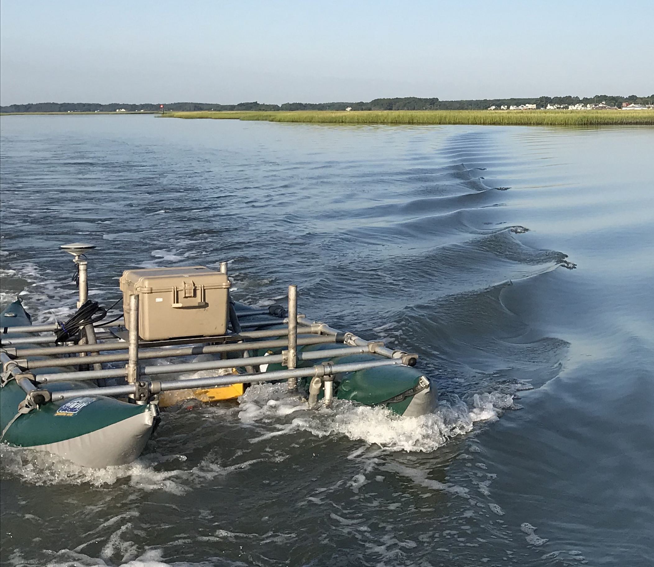 Most underwater seismic data is collected from large research vessels, but the shoreface environment is shallower than areas in which most seismic surveys occur. To get the information we need to assess changes in shoreface morphology, we mount our seismic instrument on pontoon floats towed behind our survey vessel.