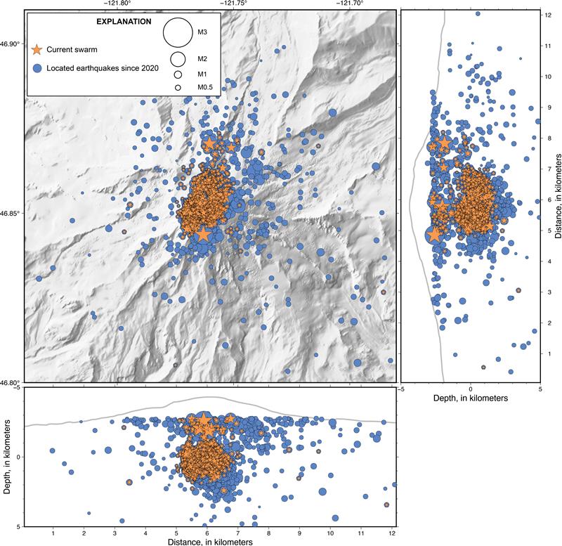 Seismicity beneath Mount Rainier, Washington, showing earthquakes during 2020-2025 in blue, and those that occurred as part of an earthquake swarm on July 8 - August 25, 2025, in orange.