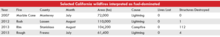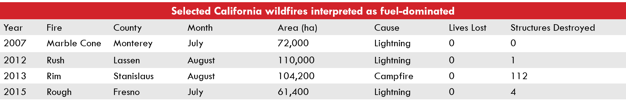 Selected California wildfires interpreted as fuel-dominatedYearFireCountyMonthArea (ha)CauseLives LostStructures Destroyed2007Marble ConeMontereyJuly72,000Lightning002012RushLassenAugust110,000Lightning012013RimStanislausAugust104,200Campfire01122015RoughFresnoJuly61,400Lightning04