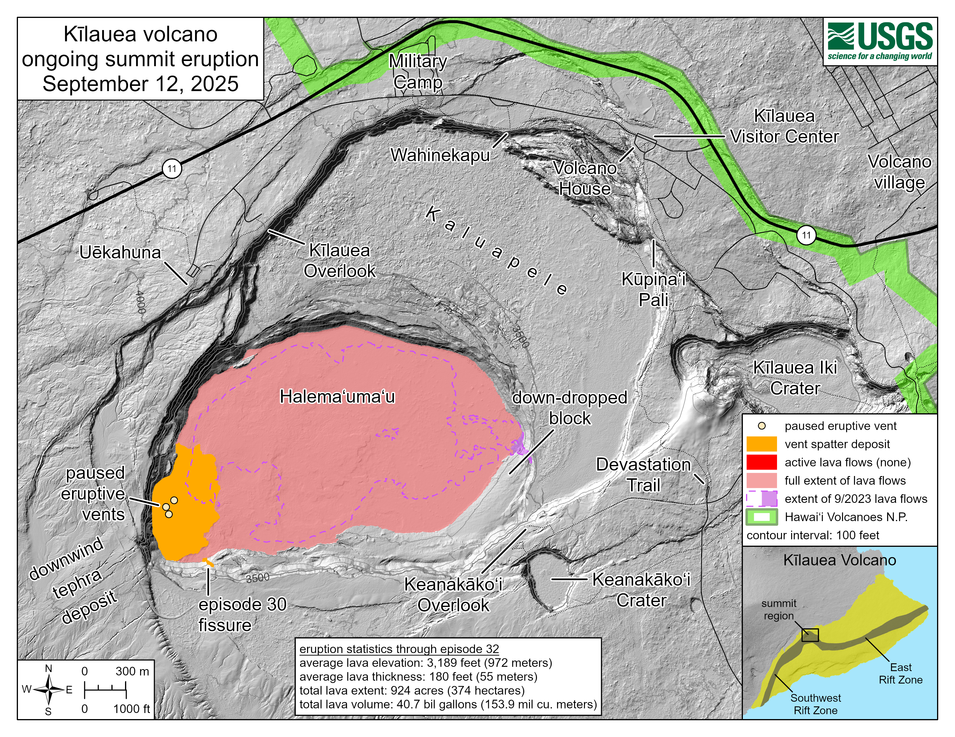 This reference map depicts the Kīlauea summit eruption within Halema‘uma‘u crater that began on December 23, 2024. As of this posting on September 12, 2025, the eruption has had thirty-two episodes, with the most recent occurring on September 2. Most of the map data included here were collected during a USGS Hawaiian Volcano Observatory helicopter overflight on September 11, so the provided statistics are reflective of the entire eruption to this point.