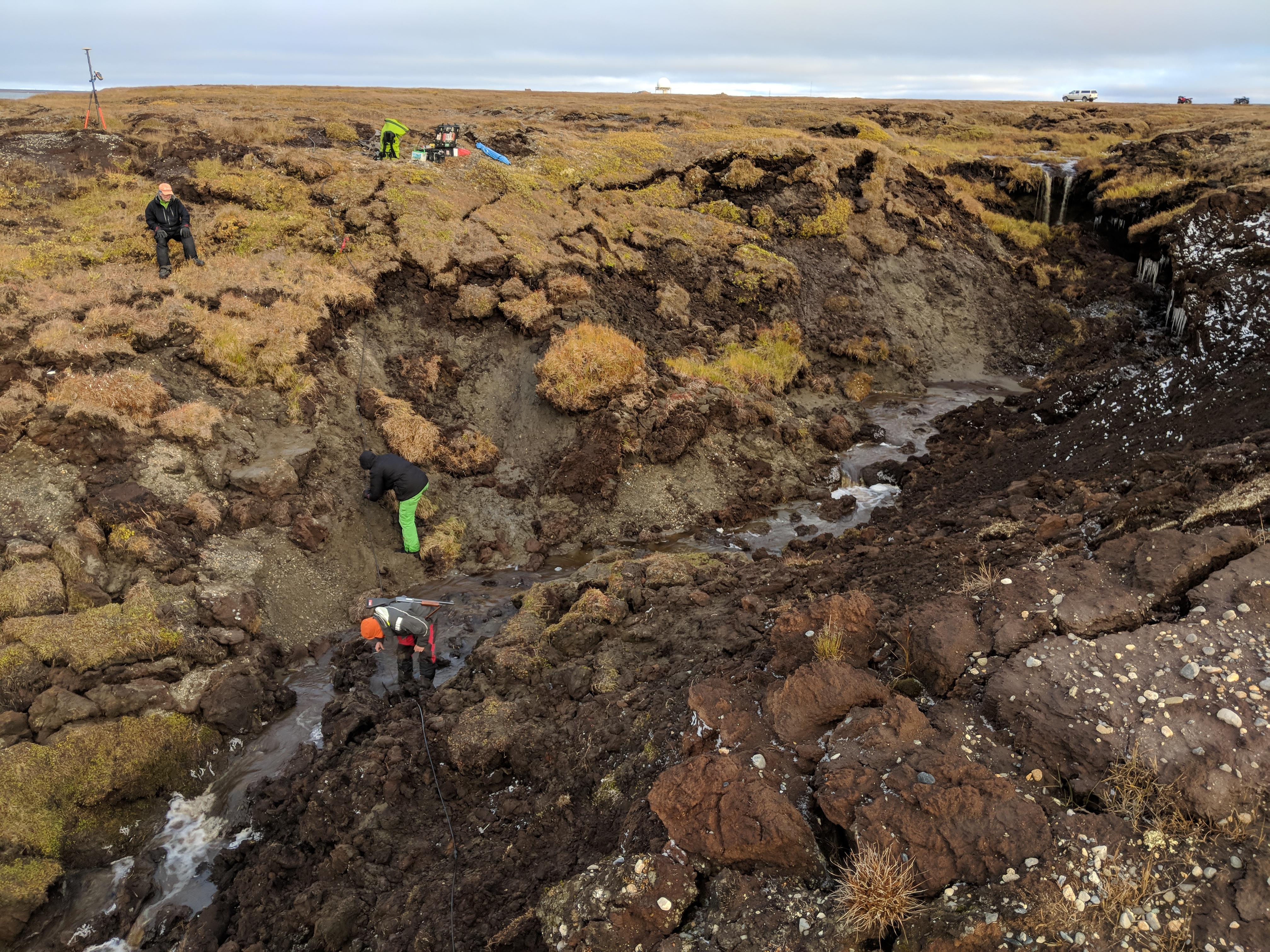 The September collection of 22 electrical resistivity tomography (ERT) transects was the largest to date on Barter Island. It entailed walking back and forth for miles over rough terrain and carrying nearly 420 pounds of equipment from site to site. Here the scientists lay an ERT cable across a gully that has rapidly expanded over the past 2 years.