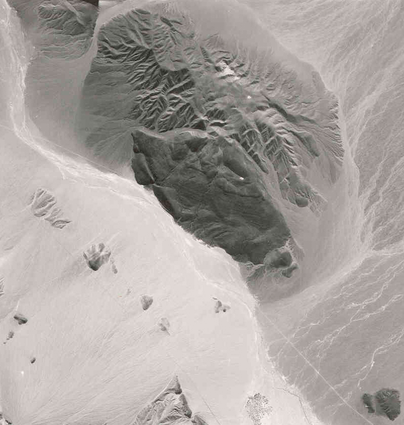 Shoreline Butte is located at the southern end of Death Valley and is at the northern end of the Confidence Hills (near the intersection of Highway 178 and the Harry Wade Road -- not shown on this image). The Amargosa River wash runs diagonally across the image, draining into Death Valley (on the left). The dry stream runs along the face of the butte where old shorelines of Lake Manly are preserved as steps on the north side of the remains of an ancient volcano. The southern side of the volcano has eroded away, exposing basin sediments uplifted along the Death Valley Fault system, the same fault system that has offset Split Cinder Cone (in the lower left-hand corner of the image) and is responsible for the uplift of the Confidence Hills. Scale (1:48,000); north is to the left.