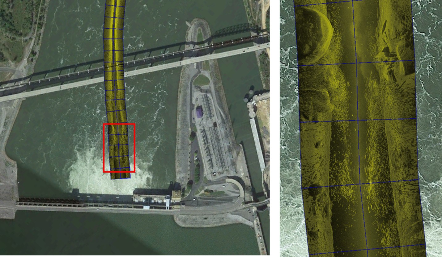Side-scan survey imagery of Kentucky Lake tailwater demonstrating strong schooling behavior and high biomass of Silver Carp below spillway.